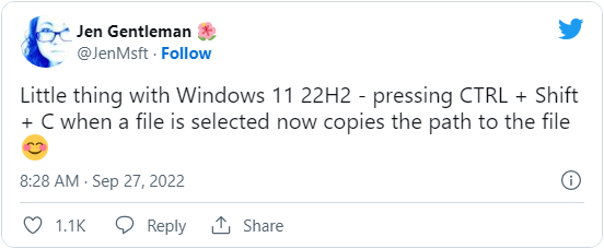 随着首轮更新推送的到来,许多人正在期盼着揭开 Windows 11 22H2 的更多彩蛋。而在周二的一条推文中,微软工程师 Jen Gentleman 就分享了一个有趣的小技巧。可知在安装了 Windows 11 22H2 更新后,用户将能够使用 CTRL+ Shift + C 的组合键,拷贝选定文件的存储路径。