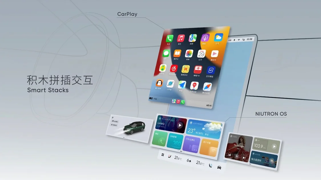 同时NIUTRON OS和CarPlay均支持在中央悬浮屏与仪表屏的双屏显示。Smart Stacks积木拼插交互可帮助用户将手机中常用的导航、娱乐等信息无缝延展。