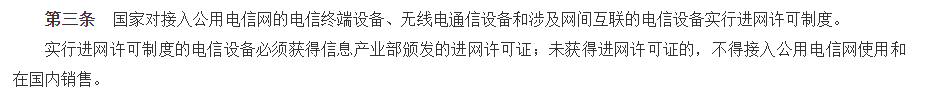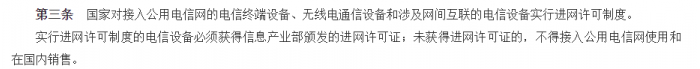 第三条 国家对接入公用电信网的电信终端设备、无线电通信设备和涉及网间互联的电信设备实行进网许可制度。
