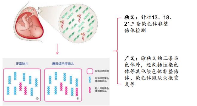 NIPT有广义狭义之分,用于检测胎儿染色体异常。和传统产前诊断相比,NIPT具有无创、高准确率、孕周限制小等优势。