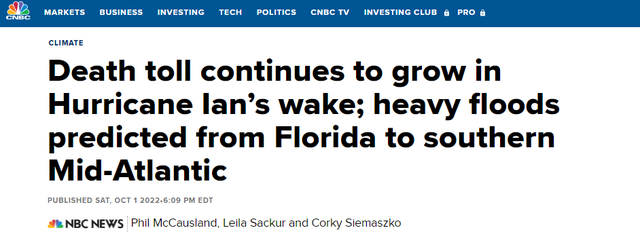 据美国消费者新闻与商业频道(CNBC)消息,截至当地时间10月1日,美国有史以来最严重的飓风之一“伊恩”在美已造成至少77人死亡。报道称,飓风“伊恩”给美国本土带来三重灾难——危险的洪水、电力中断和大规模破坏。根据佛罗里达州官员和美国全国广播公司(NBC)的统计,佛罗里达州和北卡罗来纳州有77人被证实死于飓风带来的灾难。