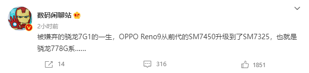 据悉,OPPO Reno9的处理器将从SM7450改为SM7325,也就是说它将不搭载最新的骁龙7 Gen 1,而是采用骁龙778G。