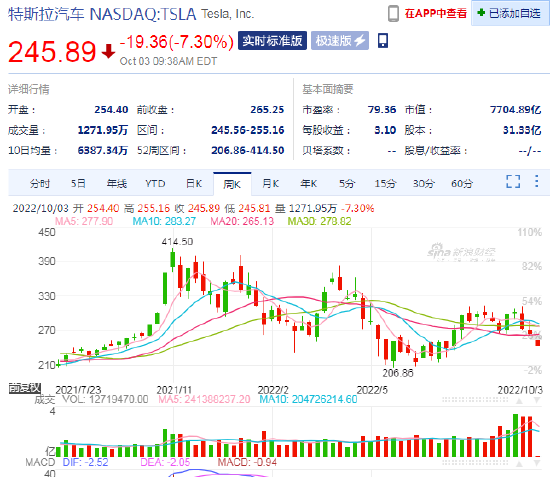 特斯拉第三季度向客户交付了343830辆汽车,低于分析师预期的358000辆。该公司称,Q3交付量不及预期的原因是物流问题,导致第三季度末在运输中的车辆增加。其股价盘前一度下跌6.5%,截至发稿,该股下跌4.74%,报252.69美元。