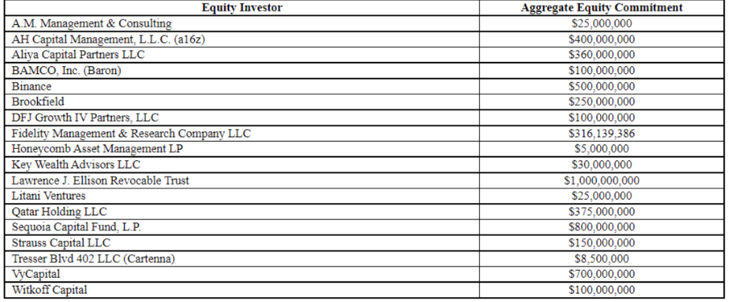他只用了大约两周左右的时间,就找来了自己的“好朋友” Larry Ellison、红杉基金、沙特 VyCapital、卡塔尔主权基金、a16z、德丰杰、Fidelity 等自己其他创业项目的老投资人,共同出资大约71亿美元左右,参与到本次收购当中。