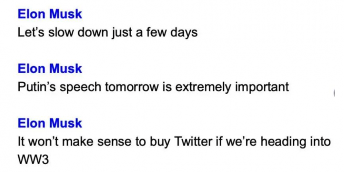 马斯克在和投行 FA 的沟通中提及俄乌军事冲突对交易的影响