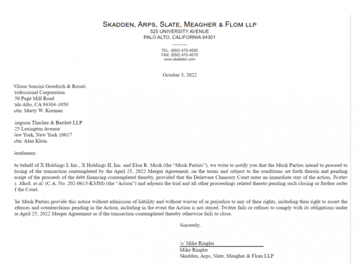 7月8日,单方面退出交易当天,马斯克突然致函 SEC 和 Twitter 董事会,表示终止对 Twitter 全资收购。随后 Twitter 将马斯克告上特拉华州商事法庭。