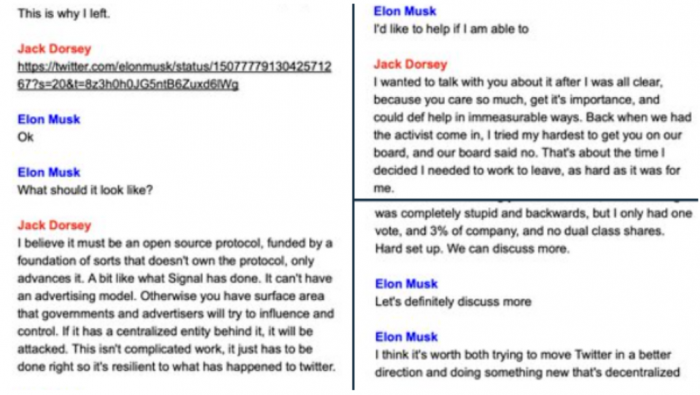 这些证词当中最为关键的一组,就是马斯克和Twitter 创始人Jack Dorsey、现任CEO Parag Agrawal,以及董事长Bret Taylor 之间的短信。