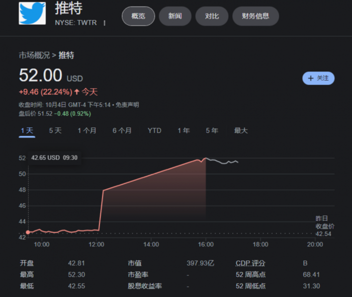 马斯克重返谈判桌的消息,极速推高了连月低迷的Twitter 股价。今日 Twitter 开盘价格$42.81,到了美东中午12点13分左右因暴涨而停牌。目前 Twitter 股票盘后价约为52美元。