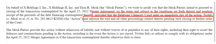 本次收购继续进行的前提条件之二,是Twitter 对马斯克方面的诉讼立即暂停(immediate stay of the action),并且和本案有关的的一切法律行动立即停止。