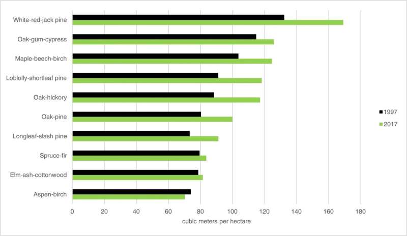 因此,为了测试这种化合物是否负责加强我们的生物群落,Sohngen的团队使用了美国林务局森林清查和分析项目(USFS-FIA)的历史数据,以比较某些森林群体的生物量在过去几十年中的变化。该研究估计,在1970年至2015年期间,树木的木材体积有了明显的增加,这与碳排放量的明显上升相关。