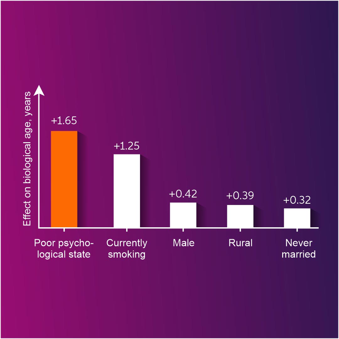 在有中风史、肝脏和肺部疾病、吸烟者以及最耐人寻味的处于脆弱精神状态的人中检测到了衰老加速。事实上,感觉不快乐、无望和孤独被证明比吸烟更能增加一个人的生物年龄。生活在农村地区(由于医疗服务的可用性较低)和单身是与加速衰老过程相关的另外两个因素。