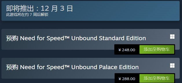 《极品飞车22:不羁》将于12月2日登陆PC、PS5和XSX/S平台。该作已上架Steam平台,标准版248元,豪华版288元。EA已确认游戏里有143辆车可供收集和定制,包含灵活小巧的欧洲车,马力强劲的美国肌肉车,以及超跑等。