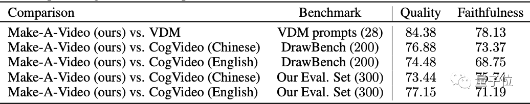 结果显示,Make-A-Video在质量和忠实度上都优于其他两种方法。