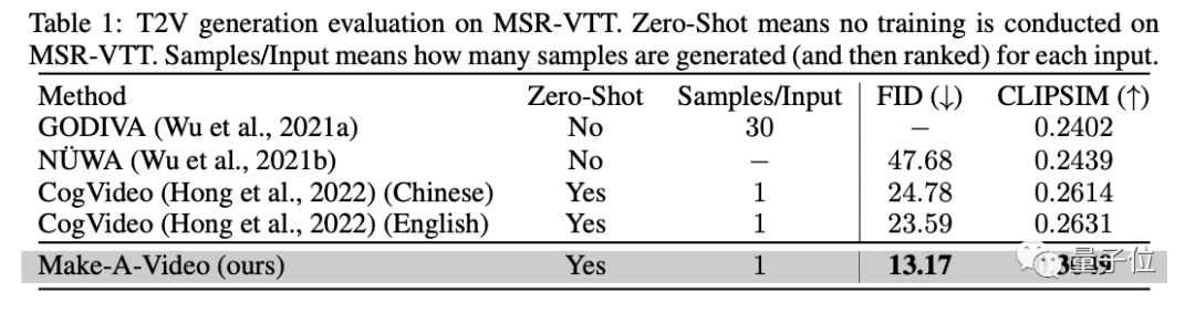 在MSR-VTT数据集上的实验结果显示,在FID(13.17)和CLIPSIM(0.3049)两项指标上,Make-A-Video都大幅刷新了SOTA。