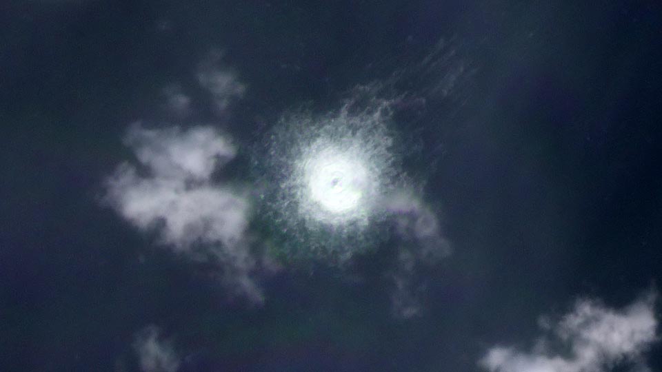 当加压的气体通过破损的管道泄漏并迅速向海面移动时,气泡的大小随着压力的降低而增加。到达海面后,大气泡扰乱了管道破裂位置上方的海面。从太空中可以从几个方面看到海面上的气体气泡的特征。