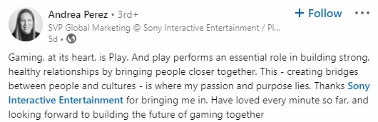 这一消息被几家媒体以及她的领英披露,佩雷斯分享了一些关于她在耐克的工作和她在SIE的新角色。佩雷斯的新职位将让她负责多个与PlayStation相关的全球营销活动。