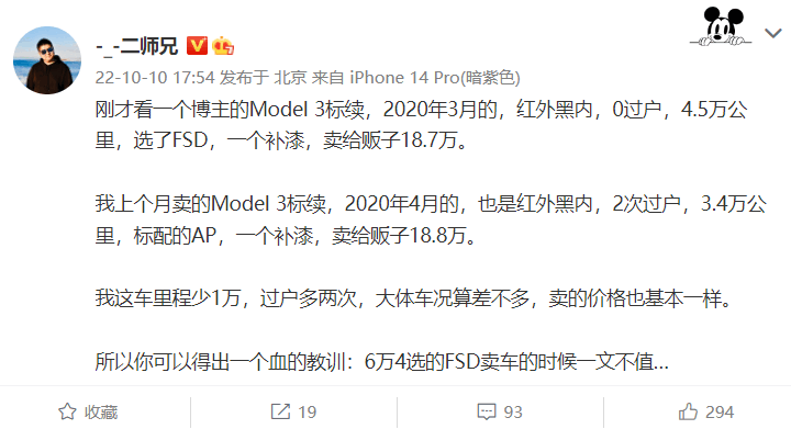 而近日,一个朋友的Model 3标续,2020年3月,红外黑内,0过户,4.5万公里,选了FSD,一个补漆,卖给贩子18.7万。