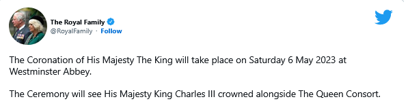 英国王室已经宣布国王查尔斯三世的加冕仪式将于当地时间2023年5月6日周六举行。仪式将在伦敦的威斯敏斯特教堂举行。他的妻子--原卡米拉·帕克-鲍尔斯,现卡米拉王妃--也将在仪式上加冕。