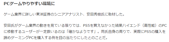 •日本玩家肉眼可见的放弃PS5,分析师表示并不是不玩游戏了,而是购买了高性能PC,转投游戏环境更加平易近人的Steam平台,PS5本身始终处于供货不足,黄牛乱舞,再加上涨价以及新型号呼之欲来传闻的影响,种种原因都在打击者PS拥趸们的信心。