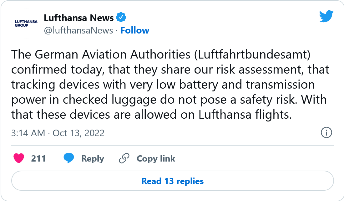 在德国媒体的初步报道之后,该航空公司的Twitter账户被要求确认禁令的存在。汉莎航空在一条推文中证实了这一传言,“从行李中禁止激活AirTags,这是因为它们被列为危险物品且需要关闭”。