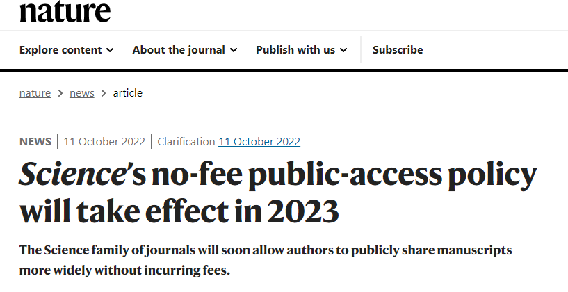 《科学》杂志出版商将允许其研究论文的作者在发表后,立即在他们选择的文献库中公开其手稿的几乎最终版本,而无需支付任何费用。这与类似高影响力期刊《细胞》和《自然》出版商所采取的做法不同,后者向大多数作者收取称为文章处理费(APC)的费用,以开放其文章的最终出版版本。