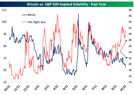 与此同时,来自Bespoke Investment Group的Jake Gordon指出,一个名为BitVol的波动率指标已经“开始崩溃”,已跌至接近今年春季以来的最低水平。该指数目前略高于69点,低于5月份的逾111点。