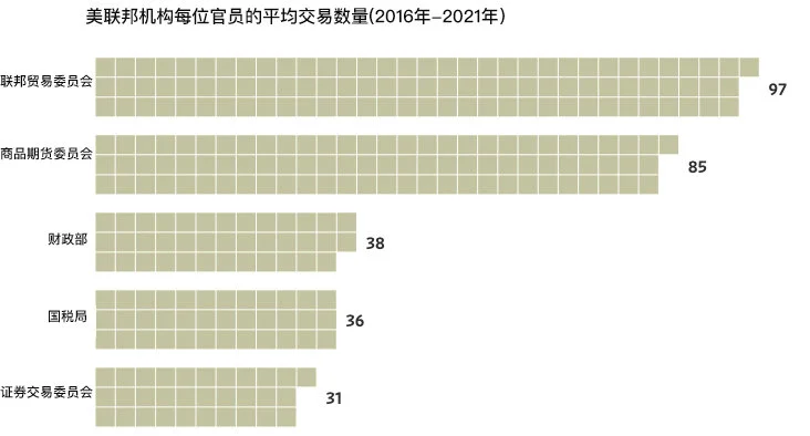 但是与此同时,美媒对2016年至2021年50家美国联邦机构的财务披露情况的调查显示,FTC高级官员披露的股票、债券和基金交易的平均数量,超过了其他任何主要机构的官员。