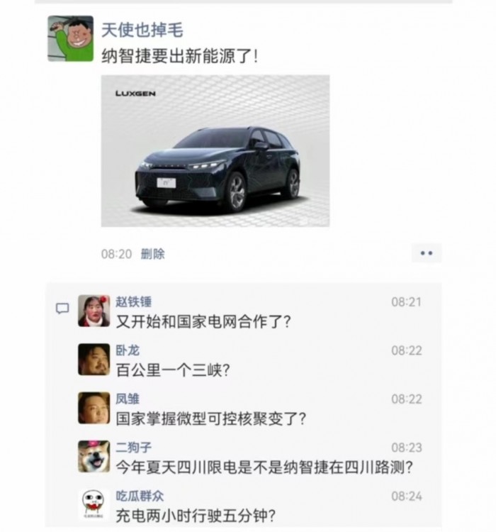 “纳智捷将搭载200度大电池,满电最高可行驶50公里,轻松解决城郊买菜问题”;“充电2小时,行驶5分钟”;“哈哈,大家都黑出情怀来了”,一时间,网络上充满了欢乐的气氛。
