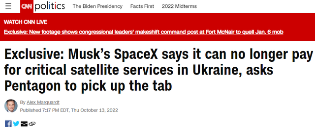 “独家:马斯克的SpaceX公司称其无法再支付在乌克兰的关键卫星服务费用,要求五角大楼买单。”美国有线电视新闻网(CNN)13日以此为题发表独家报道称,虽然“星链”卫星终端在乌克兰与俄罗斯的冲突中发挥重要作用,但这一“慈善项目”可能即将结束,因为提供该服务的美国太空探索技术公司(SpaceX)上月警告五角大楼,除非美军方面每月投入资金,否则该公司可能会停止资助乌方使用“星链”项目的费用。