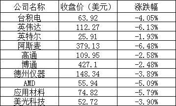 芯片龙头股普遍下跌,英伟达和阿斯麦跌幅超过6%,AMD和应用材料跌幅超过5%,台积电跌幅超过4%。