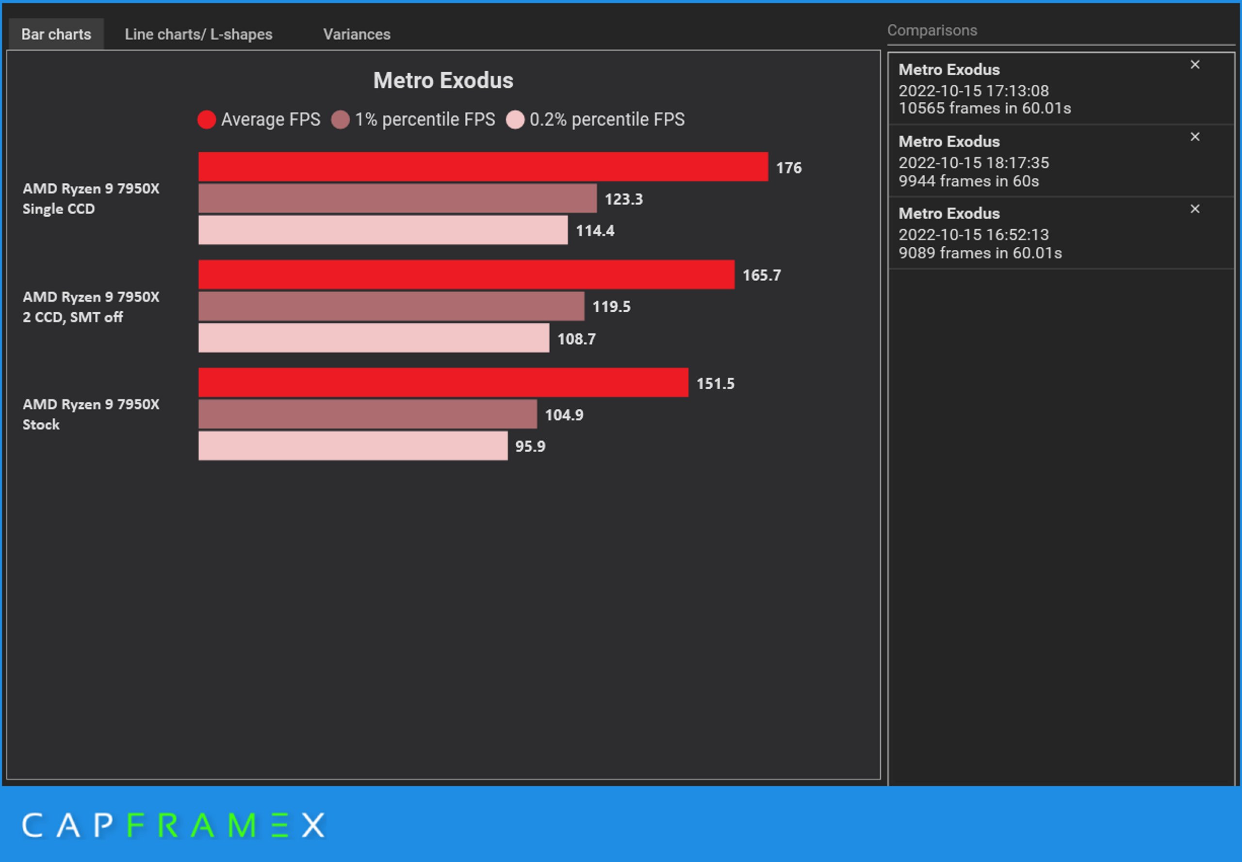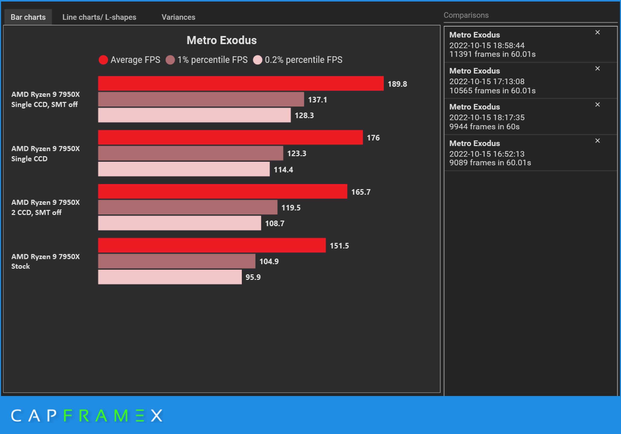 现在随着最近Windows 11版本22H2的发布,看起来一个新问题正在困扰着基于Zen 4的Ryzen 7000系列CPU。CapFrameX(CFX)发现,当16核Ryzen 9 7950X的单CCD(CPU计算芯片)被激活时,该配置的性能反超了默认的双CCD 7950X。每个Zen 4 CCD都有8个核心及其缓存,因此,从本质上讲,八核心的Zen 4 CPU能够胜过核心数较高的16核心。