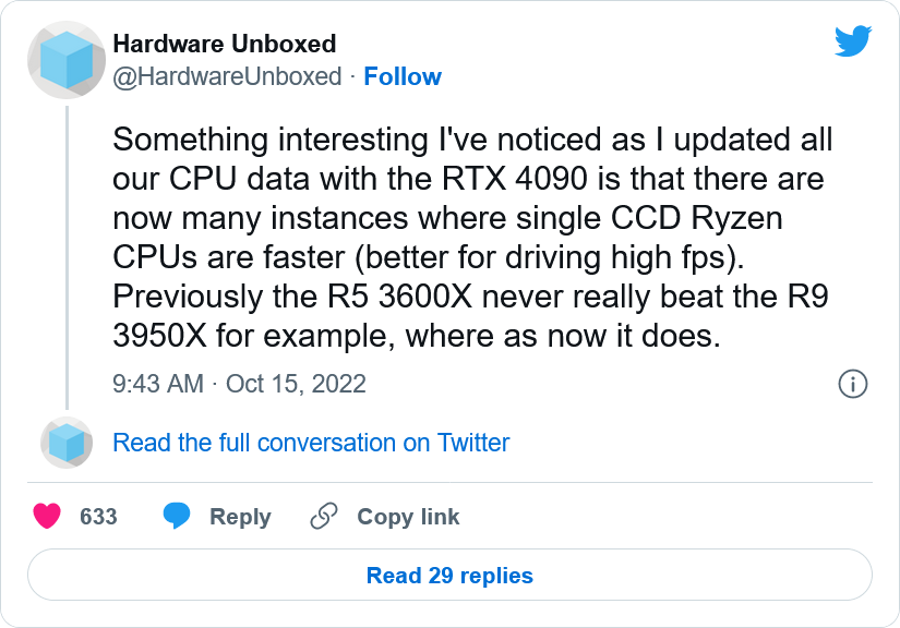 性能问题似乎在Windows 11 22H2上普遍存在(通过@OneRaichu),从外观上看,似乎Windows 11 22H2在新的Ryzen 7000 CPU上出现了调度问题,这就是为什么更多线程没有帮助操作系统参与运算。这里也可能有一个类似于最近发生的类似于NVIDIA的驱动程序错误。也许GPU驱动程序本身没有正确利用额外的线程。