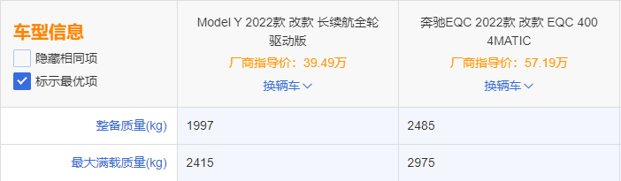 还是把 EQC 和 Model Y 对比,这俩车的电池容量几乎相同( 都是 79kWh 左右 ),但是两辆车的车重差了有半吨。