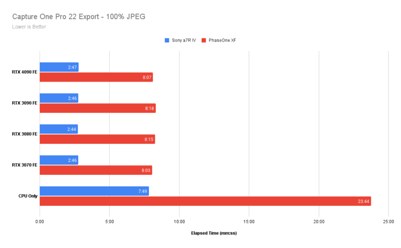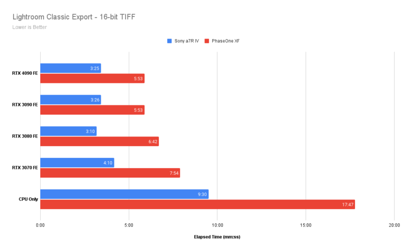 但是原文指出,对摄影师来说,RTX 4090显卡的12999元就可以省下来了,不是说性能没提升,而是没有必要,只要用1/3左右的价格购买RTX 3080级别的显卡,就可以获得差不多90%的性能,特别是在摄影师常用的Lightroom Classic、Capture One Pro 和 Photoshop应用中。