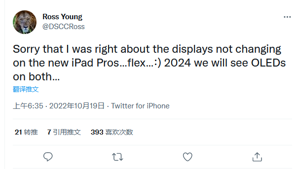 Rose Young:配OLED面板的iPad Pro将于2024年上半年推出