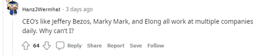 比如网友 HanzJWermhat 就指出,“贝佐斯、扎克伯格、马斯克都同时管理多家公司。凭什么我就不可以?”