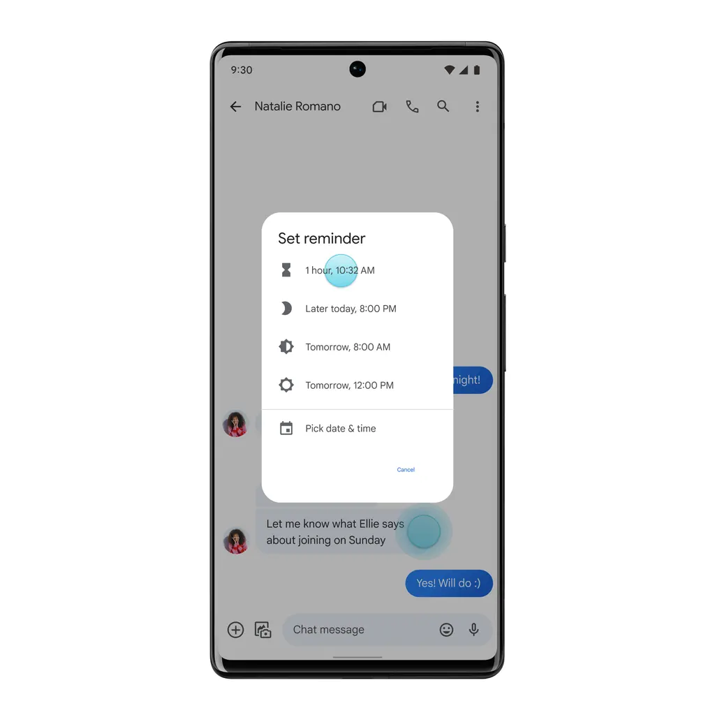 Google Messages 应用程序还将提出更多建议。如果您收到包含地址或电话号码等重要信息的消息,“Google Messages”应用程序会智能地建议您为该消息“加星标”,以便您以后更轻松地找到它。该应用程序还将根据某些消息的内容建议上下文操作,例如开始 Meet 通话或添加日历事件。