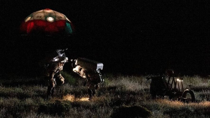 来自NASA的JETT3(联合舱外活动和人类表面移动计划测试小组系列的第三次任务)的试验从10月4日到10月9日进行。宇航员Drew Feustel和Zena Cardman在天黑后进行月球行走模拟,月球南极的光影由一个球形的多面"照明车"系统复制,图为两名宇航员在黑暗中注视着地面,旁边是悬停在杆子上的球形多面照明平台。