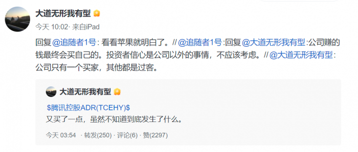 至于他持续买入腾讯的动机,段永平在跟网友的对话中显示他认可的还是之前自己做价值投资的那一套,认为其他人都是过客,公司只有一个买家,腾讯现在的情况像是苹果回购自家股票那样。