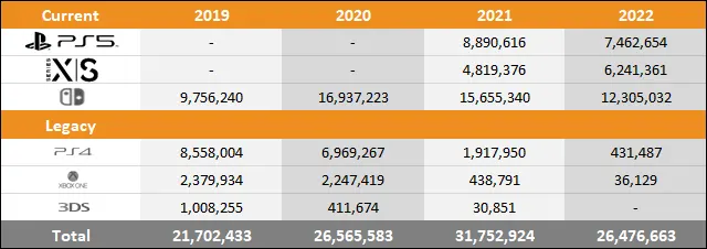 下图显示了 2022 年三大主机各自相对于过去两年同期的销售表现。