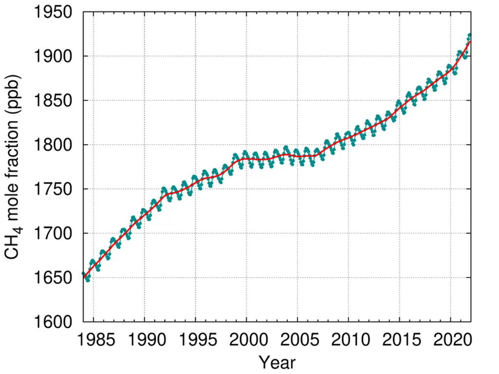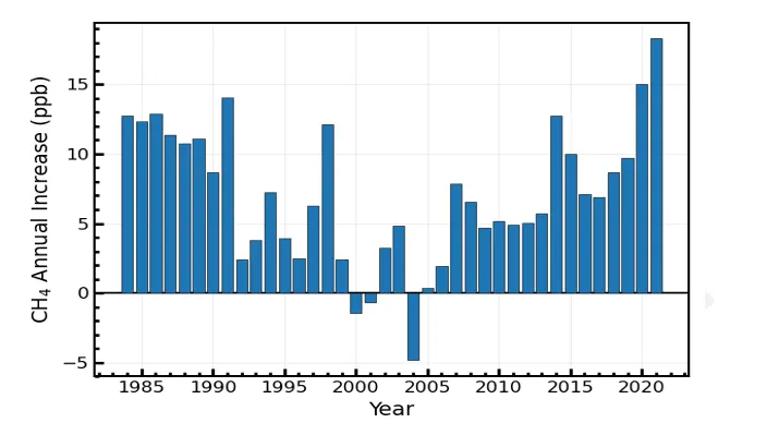 WMO 自 40 年前开始跟踪以来,2021 年是大气甲烷浓度同比增幅最大的一年。随着这一跃升,2021 年大气中残留的甲烷量是工业革命前的 262%。一旦甲烷进入大气,它在加热地球方面的威力最初是二氧化碳的 80 倍。据估计,自工业革命以来,目前全球气温上升的 30% 是由甲烷造成的。