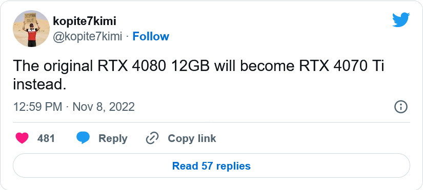 将RTX 4080 12GB变成RTX 4070 Ti后,原来的RTX 4070的命运又留下一个问号。根据多产的硬件泄密者Kopite7kimi的说法,NVIDIA已经通过将未推出的卡称为RTX 4070 Ti来解决这个问题,许多人预计它将采取这种做法。