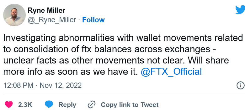 Miller在晚上早些时候发推文说,他正在"调查与跨交易所合并ftx余额有关的钱包移动的异常情况"。