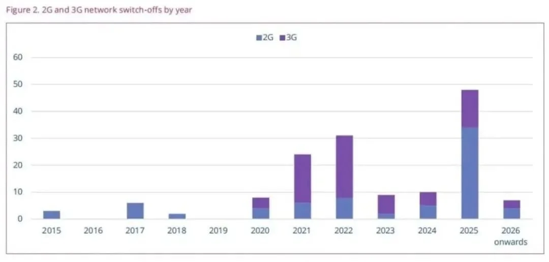 从全球范围来看,根据GSA数据,43个国家和地区的76家运营商已完成或计划关闭2G网络,42个国家和地区的80家运营商已经完成、计划或正在进行3G关闭。