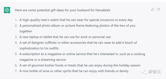 然后ChatGPT假设我的丈夫是犹太洁食者,并且他喜欢科技和手表。这并没有错,但这不是我所希望的答案。
