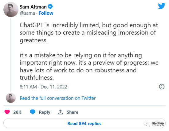 OpenAI的CEO Sam Altman自己也提到,ChatGPT现在还有很多限制,并且在稳健性和可靠性方面也有很多要加强的地方,想要完全依赖它还为时尚早。