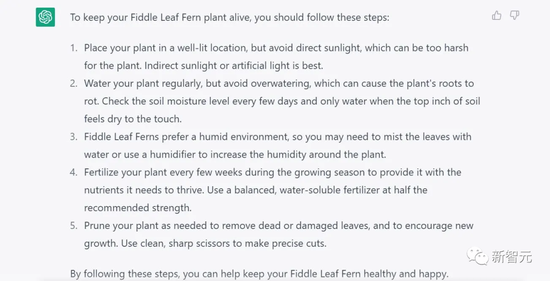 而这次我尝试在ChatGPT上寻找答案,我输入‘我怎样才能让我的琴叶蕨植物存活下来’?结果和我从植物公司Easy Plant收到的方案一致。
