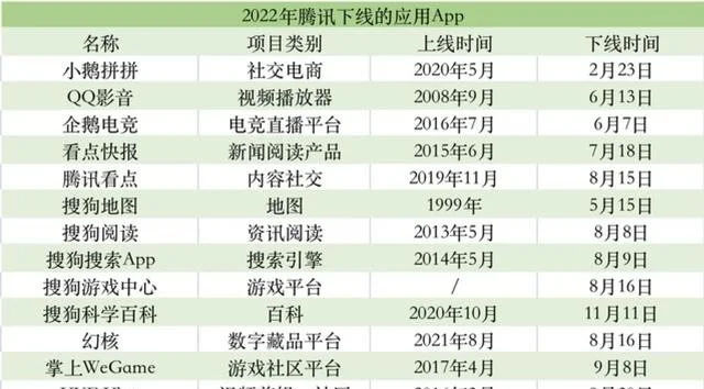 据时代财经,2022年腾讯至少关停、下架App应用16款,包括幻核、QQ影音、看点快报、搜狗地图、腾讯WiFi管家等一众知名产品。倘若再加上29款被裁撤的游戏,则至少关停45个项目。