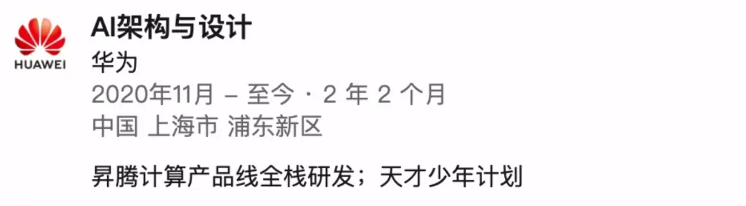 他在领英的动态尚未更新,自我介绍是在华为从事昇腾计算产品线的全栈研发工作。