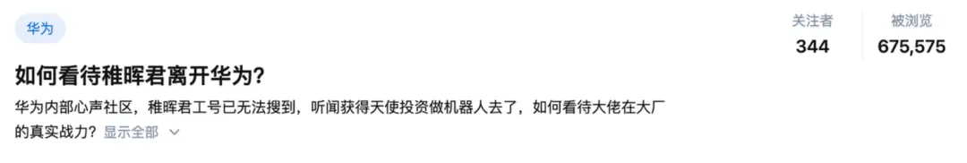 这名知情人士还表示,公司内部很多人都挺喜欢稚晖君,他离职对华为确实是一个损失。
